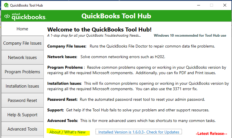 • From your QuickBooks Tool Hub, go to the option labeled About/what’s new.